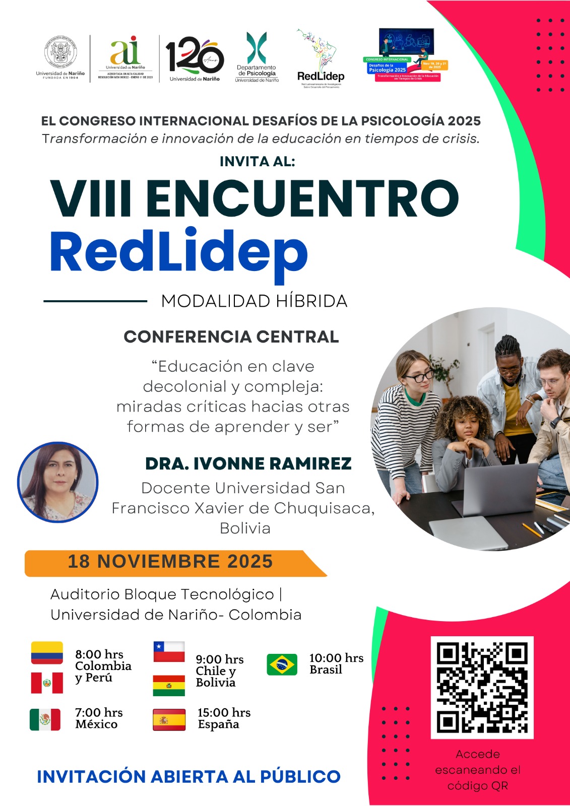 Extendemos la cordial invitación al VIII Encuentro de la Red Latinoamericana de Investigación sobre Desarrollo del Pensamiento - RedLidep, el cual se realizará en el marco del Congreso Internacional Desafíos de la Psicología 2025: Transformación e innovación en la...